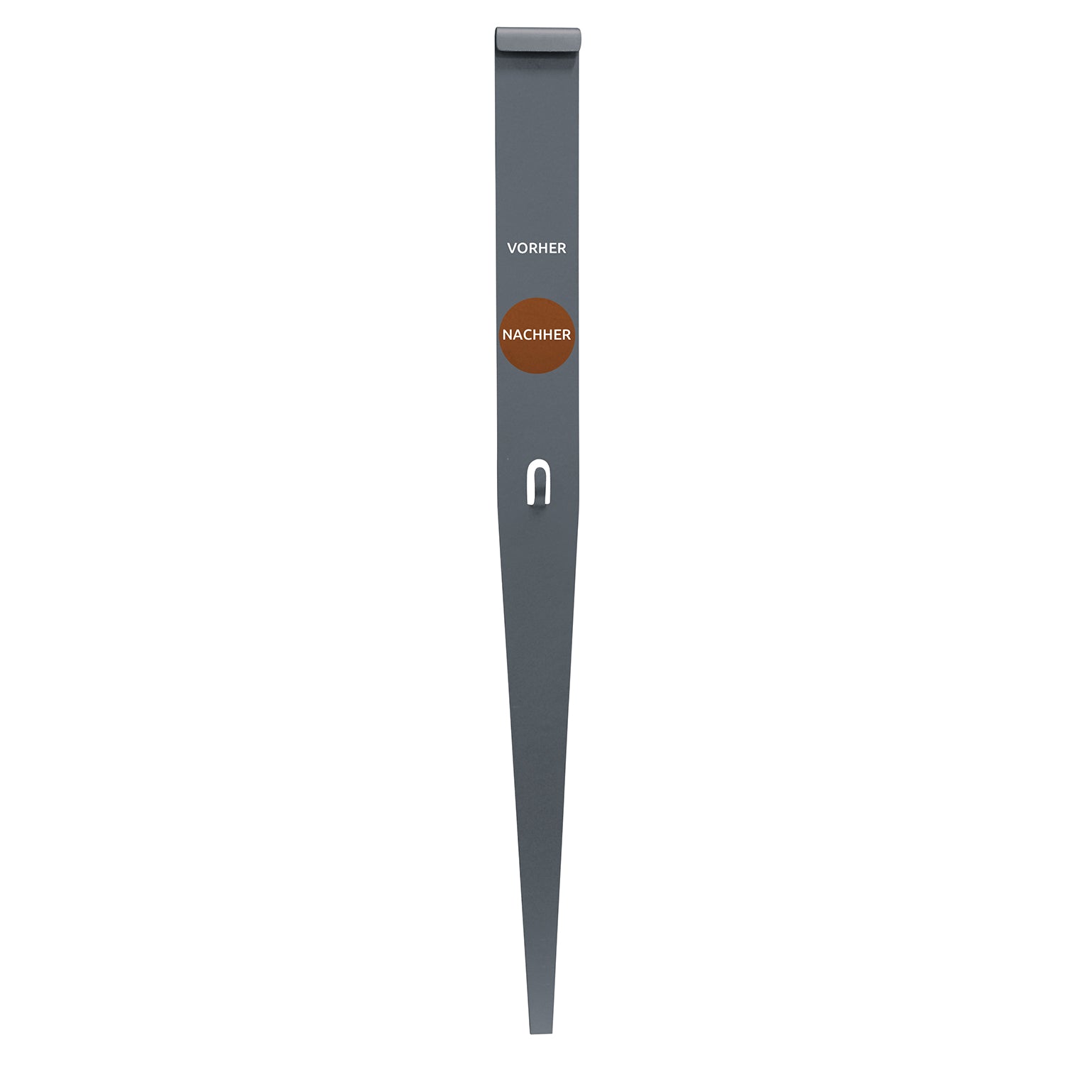 Der Bodenanker besteht aus Cortenstahl, einem witterungsbeständigen Material, das eine natürliche Rostpatina bildet und besonders langlebig ist.