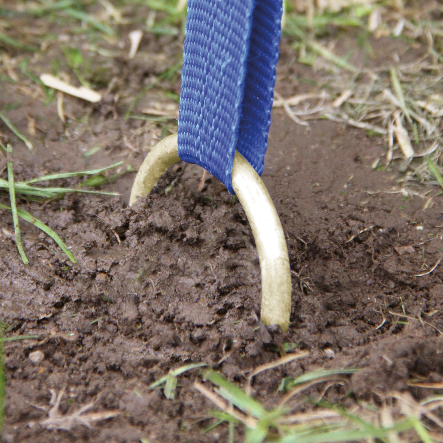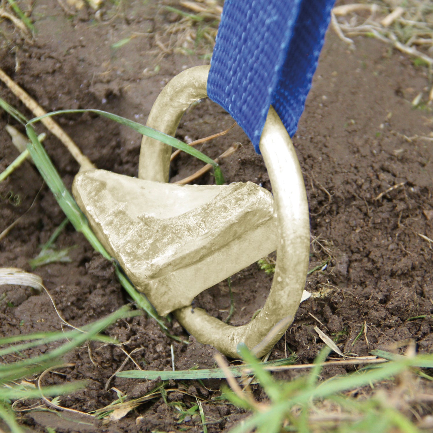 Der Bodenanker wird in den Boden eingeschlagen und bietet dadurch eine stabile Verankerung.