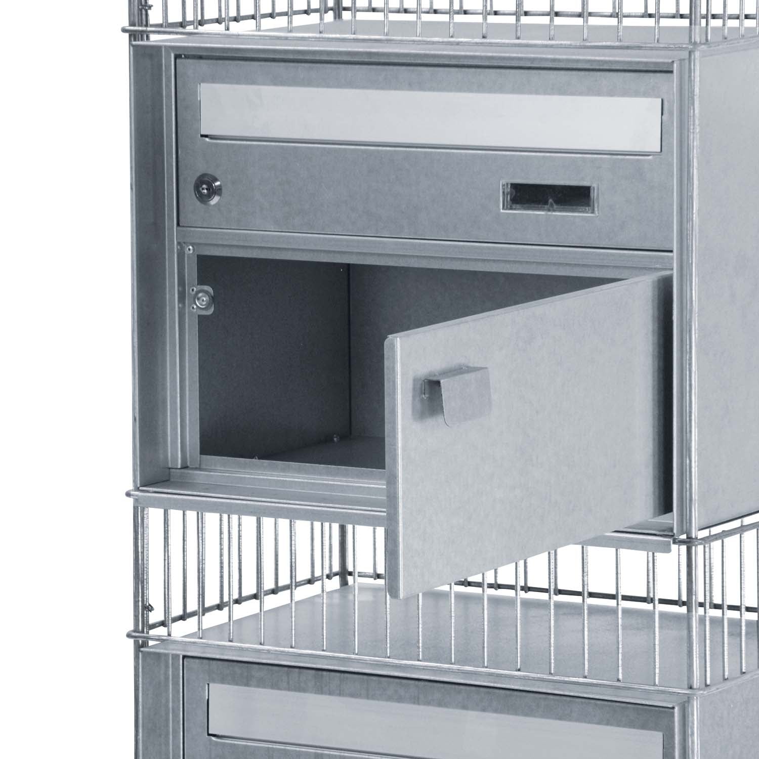 Das Befestigungsmaterial zur Montage auf einer betonierten Fläche und 2 Schlüssel je Briefkasten sind inklusive. Die Lieferung erfolgt fix und fertig vormontiert ohne Steine. Die Gitter sind Zink-Aluminium verzinkt für eine lange Lebensdauer.