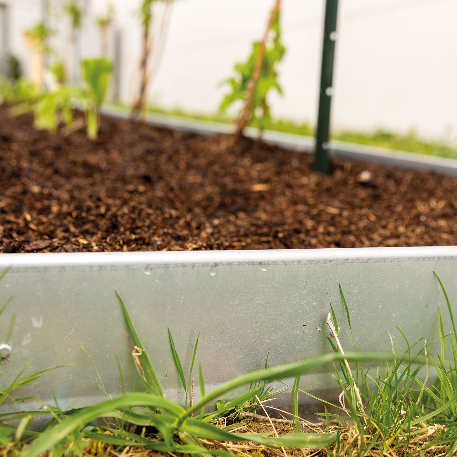 Das Eckteil besteht aus 1 mm starkem, verzinktem Stahl. Die Verzinkung schützt vor Rost und sorgt für eine lange Haltbarkeit im Außenbereich.