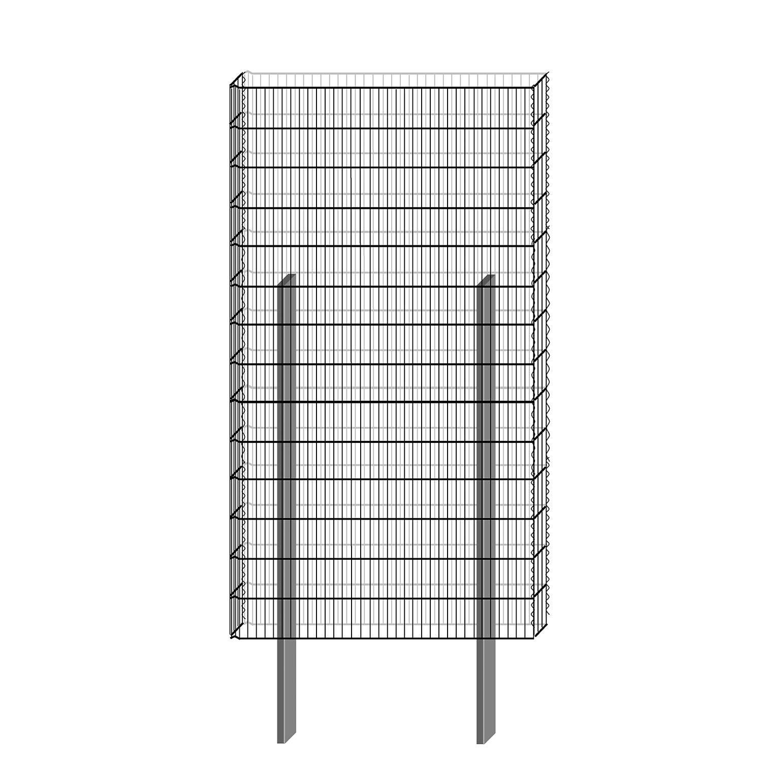 Die Gabione hat eine Länge von 115 cm, eine Tiefe von 12 cm und eine Höhe von 210 cm.