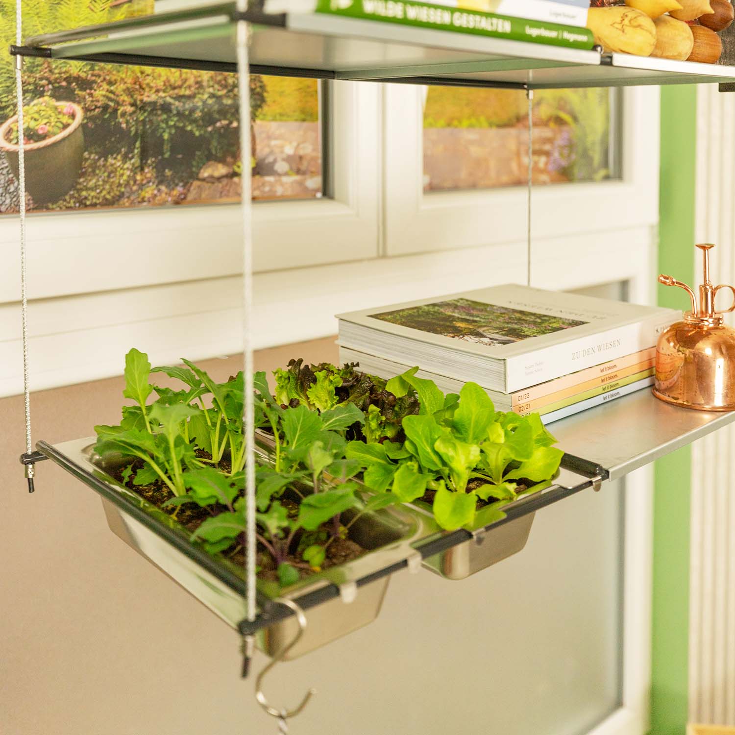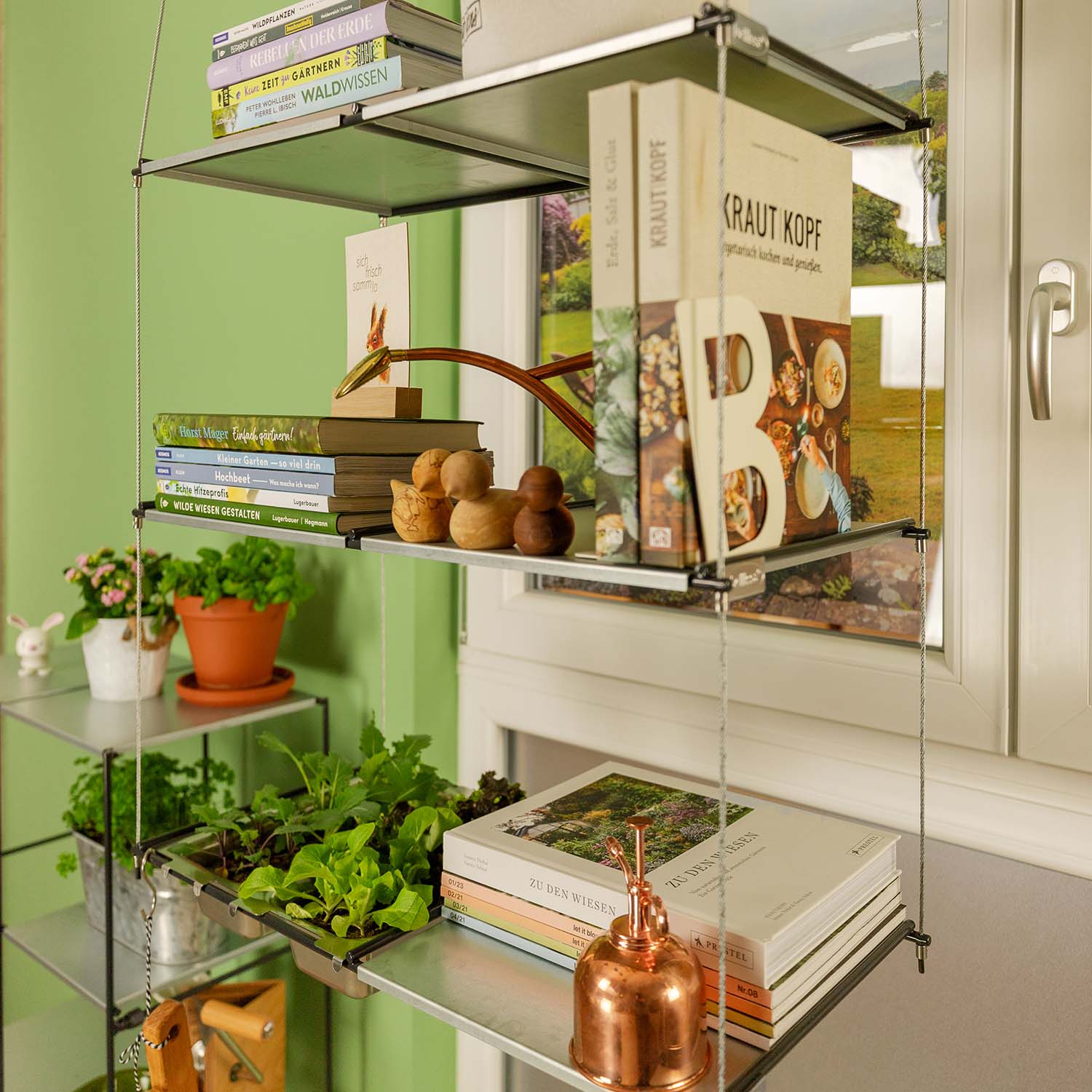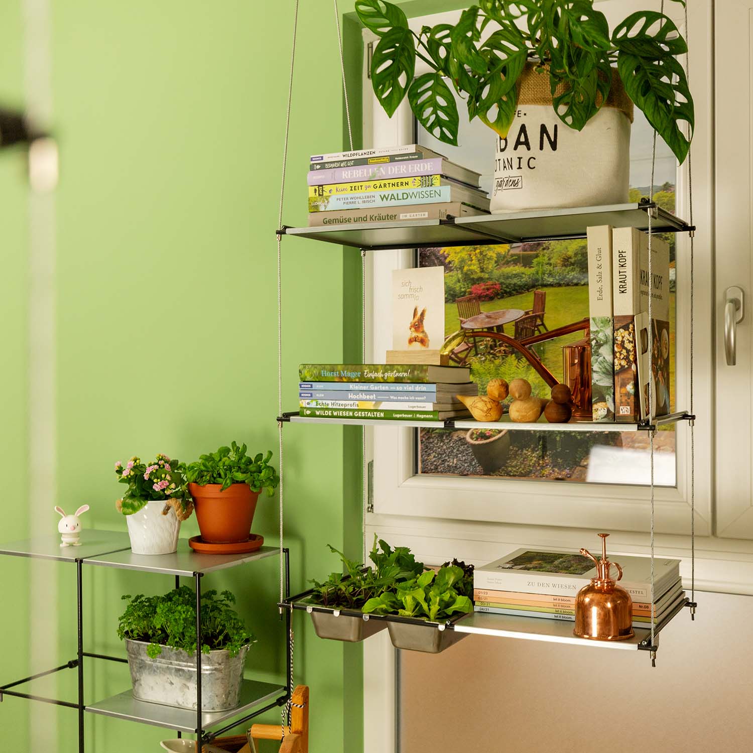 Das Hängeregal dient nicht nur als Raumteiler, sondern bietet auch auf seinen Fachböden viel Platz für Pflanzen, Bücher und andere Dekorationsgegenstände.