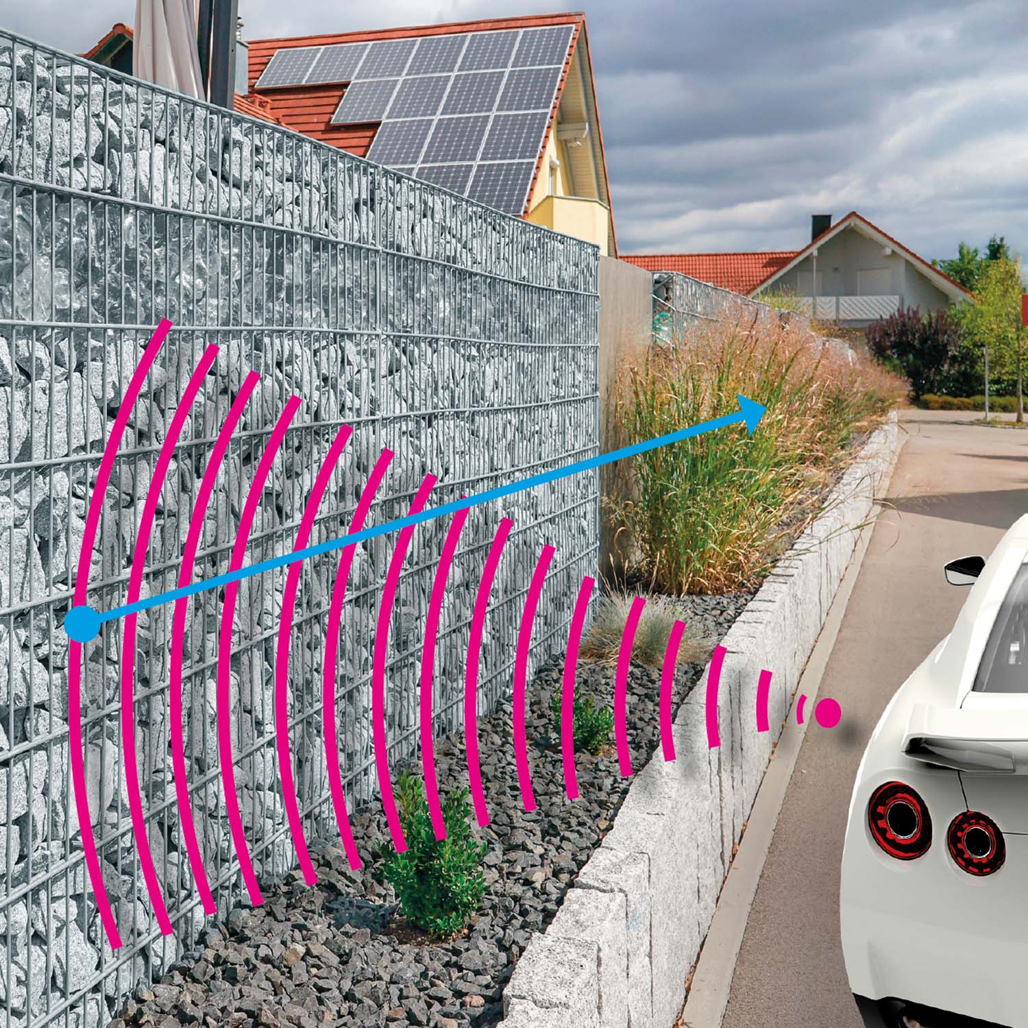 Die Gabione bietet einen Schalldämmwert von 24 dB und verbessert so die Lebensqualität durch Lärmschutz. Sie ist zudem ein attraktiver Sichtschutz.