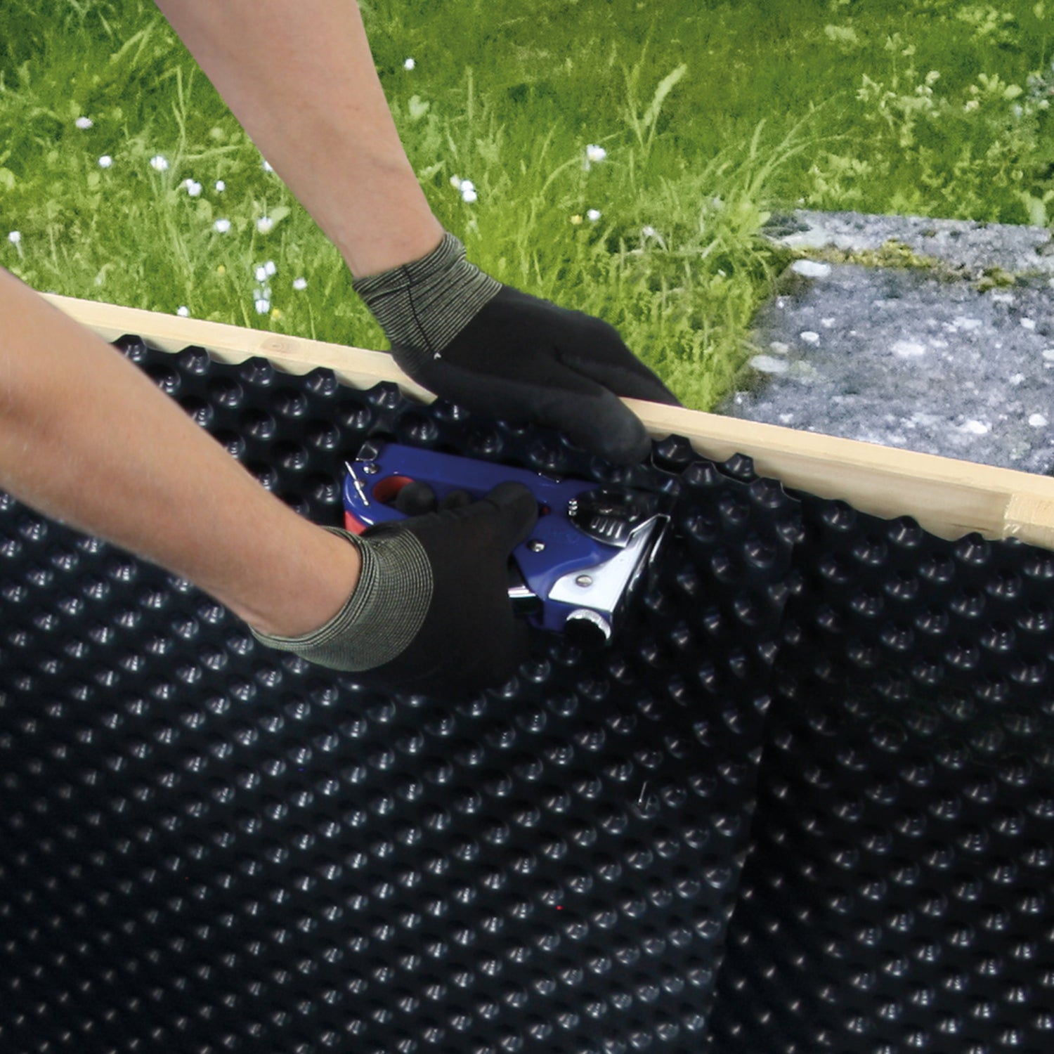 Die Noppenfolie besteht aus widerstandsfähigem Kunststoff.