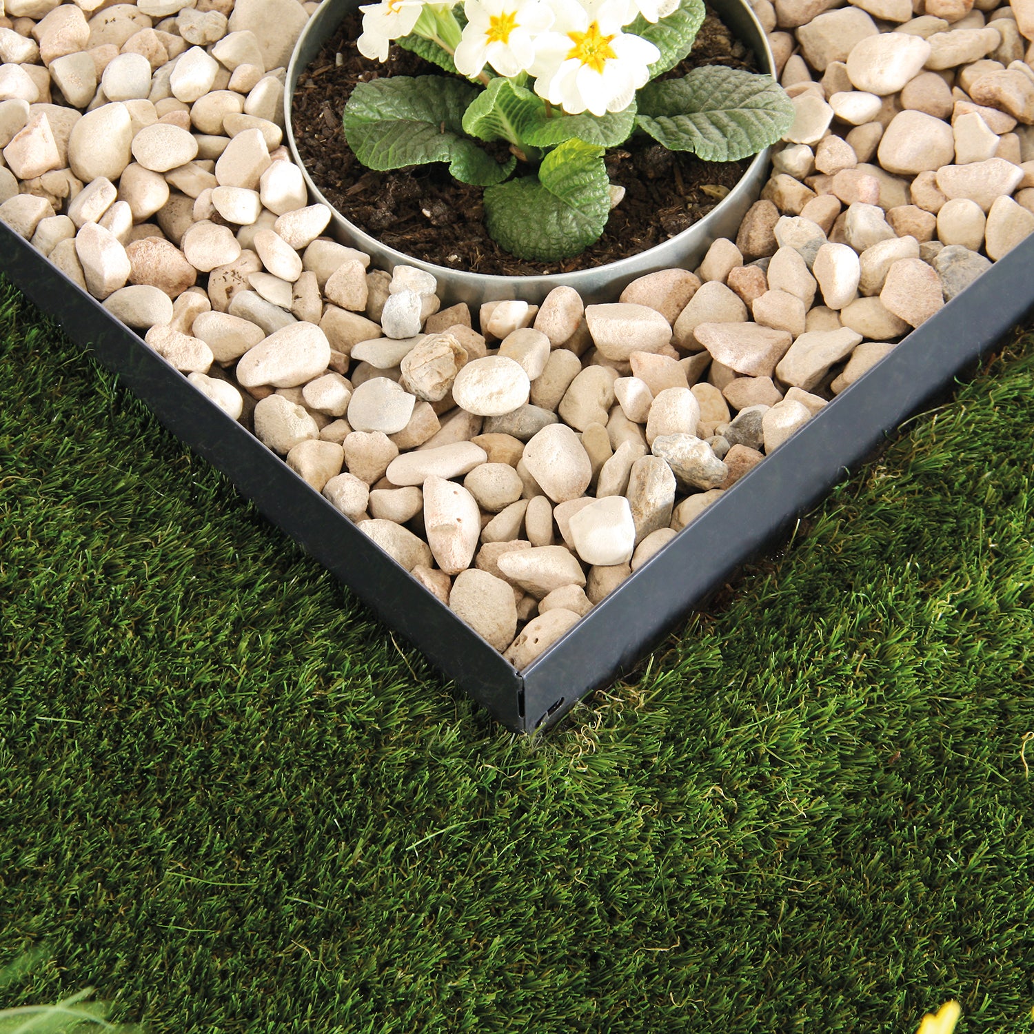 Die Rasenkante besteht aus verzinktem Metallblech mit einer Stärke von 0,65 mm und ist anthrazit pulverbeschichtet.
