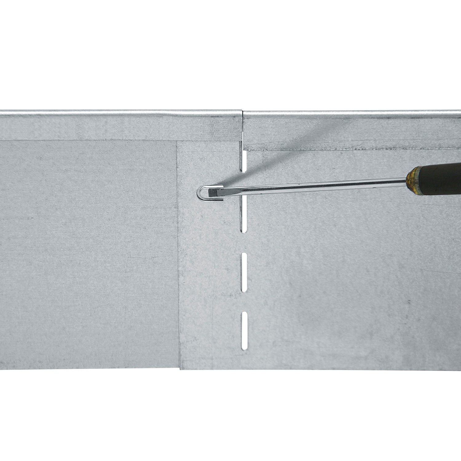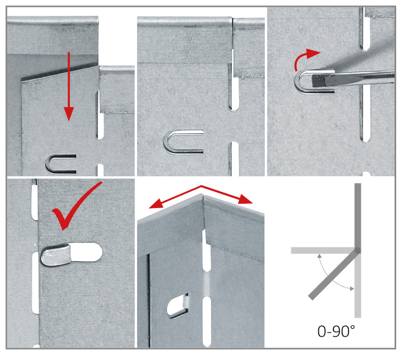 Die Elemente werden zusammengesteckt und durch Umknicken eines eingestanzten Pins fixiert. Eine variable Winkeleinstellung bis 90° ist möglich.