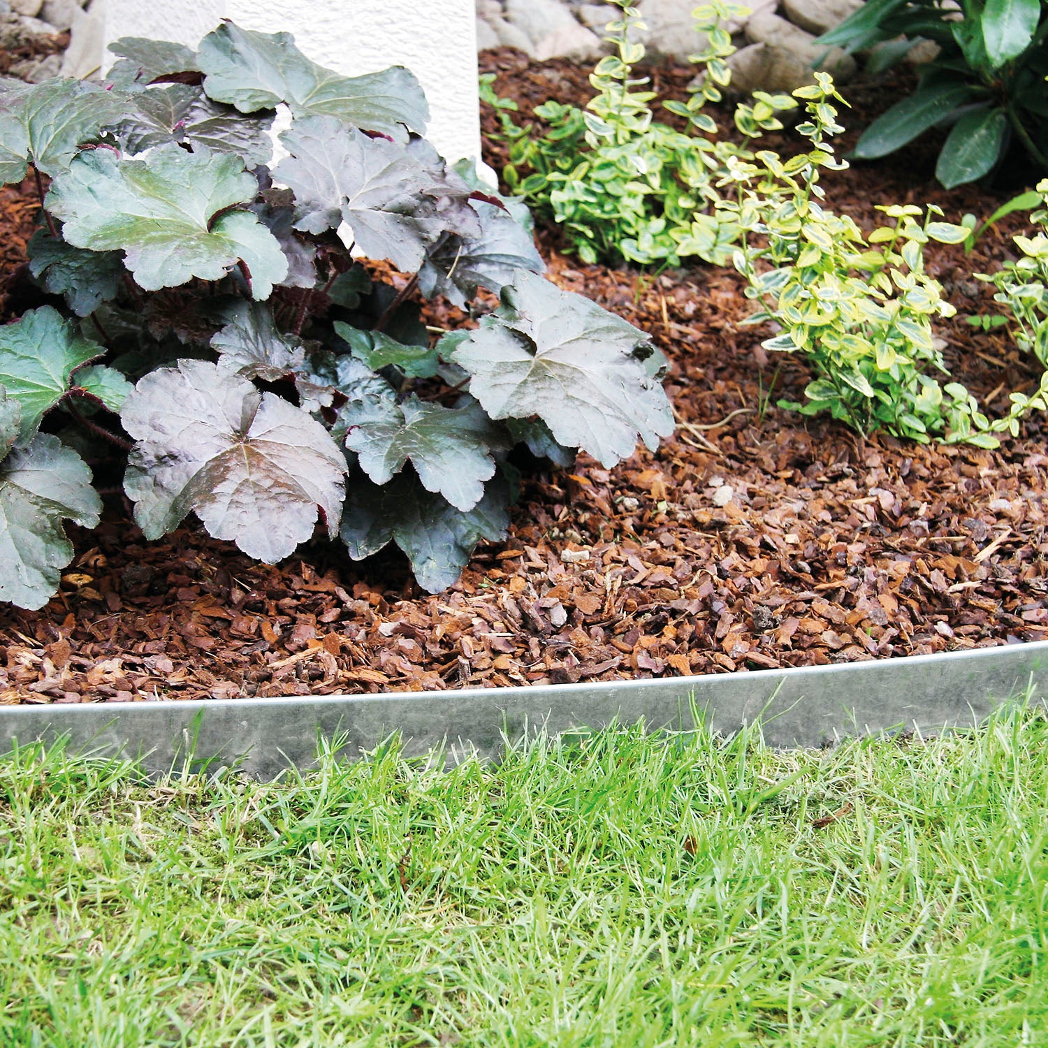 Die Rasenkante besteht aus 0,65 mm starkem, verzinktem Stahlblech, das robust und witterungsbeständig ist.