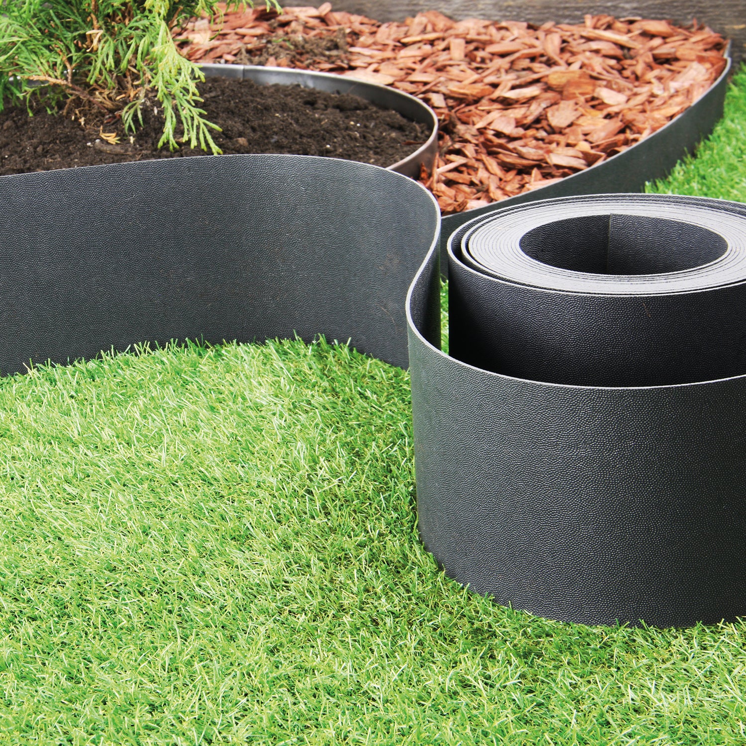 Es handelt sich um eine flexible Kunststoffrolle zur Abgrenzung von Rasenflächen und Beeten.