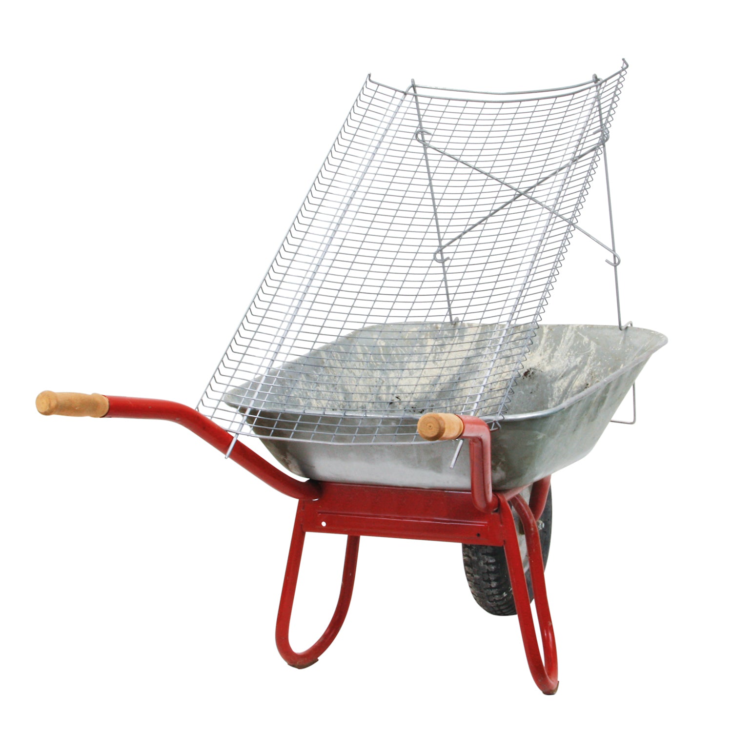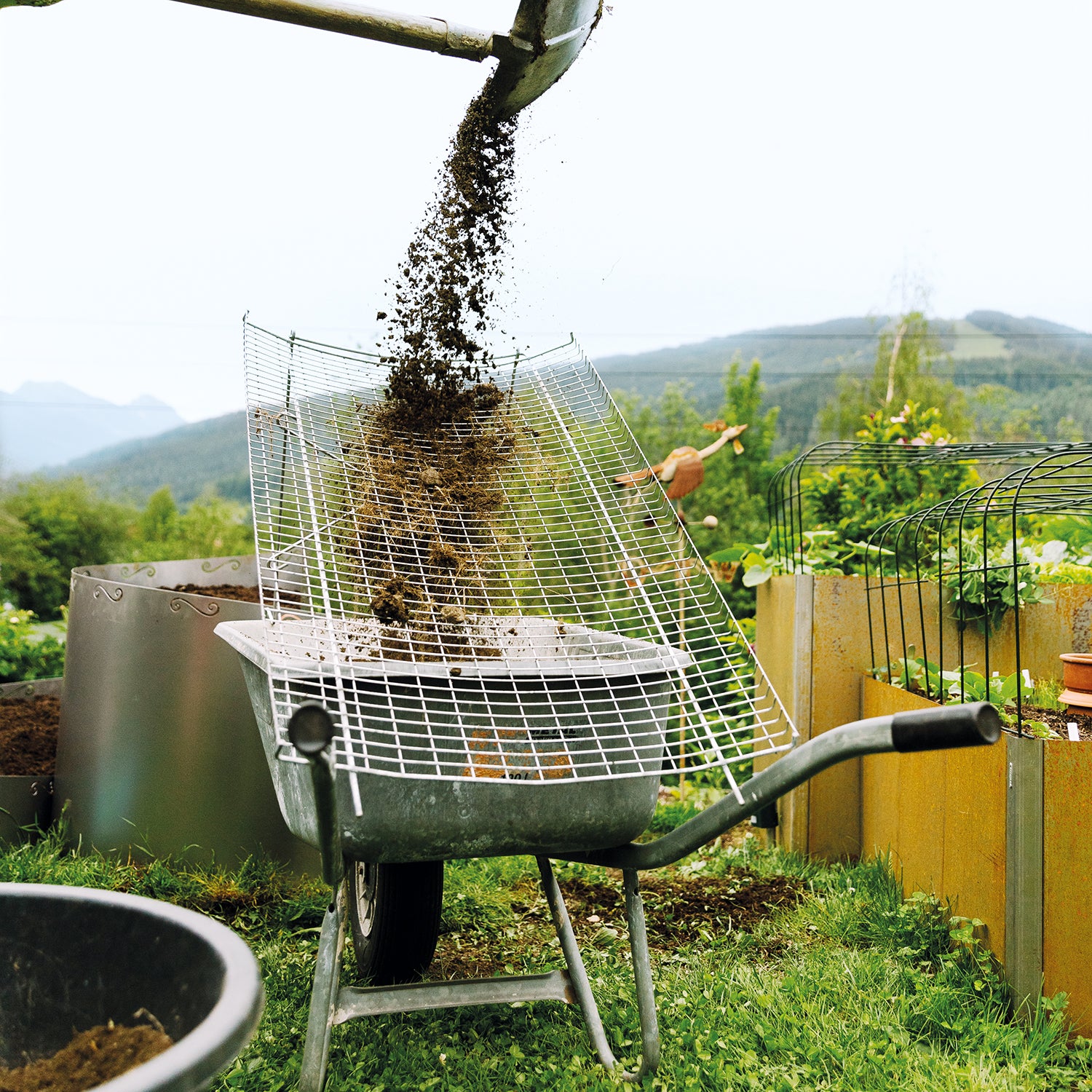 Sie können es freistehend, oder praktischerweise gleich auf einer Schubkarre gestellt, verwenden. Der Aufstellbügel an der verstellbaren Stütze sorgt dabei für einen sicheren Halt. Die groben Bestandteile rutschen an der schrägen Fläche ab und können für den nächsten Komposthaufen wiederverwendet werden.