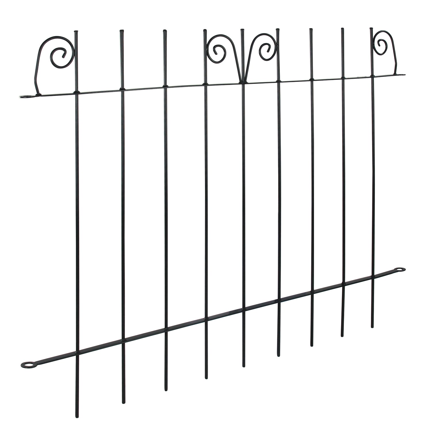 Der Zaun besteht aus geschmiedetem und pulverbeschichtetem Metall, was ihn robust und wetterbeständig macht.