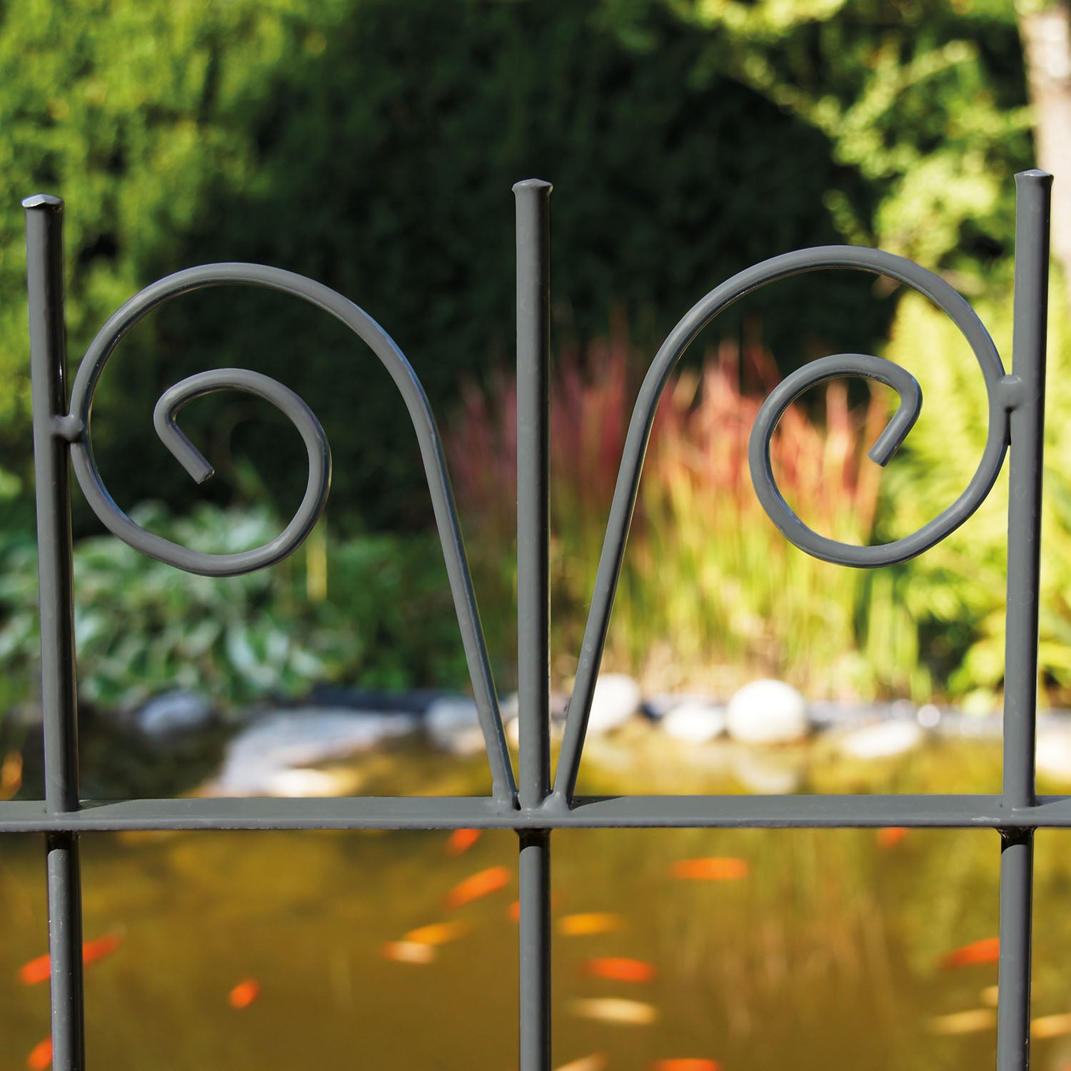 Der Bellissa Teichschutzzaun ist ein dekorativer und schützender Zaun aus geschmiedetem, pulverbeschichtetem Metall, der verhindert, dass Menschen und Tiere in den Teich fallen.