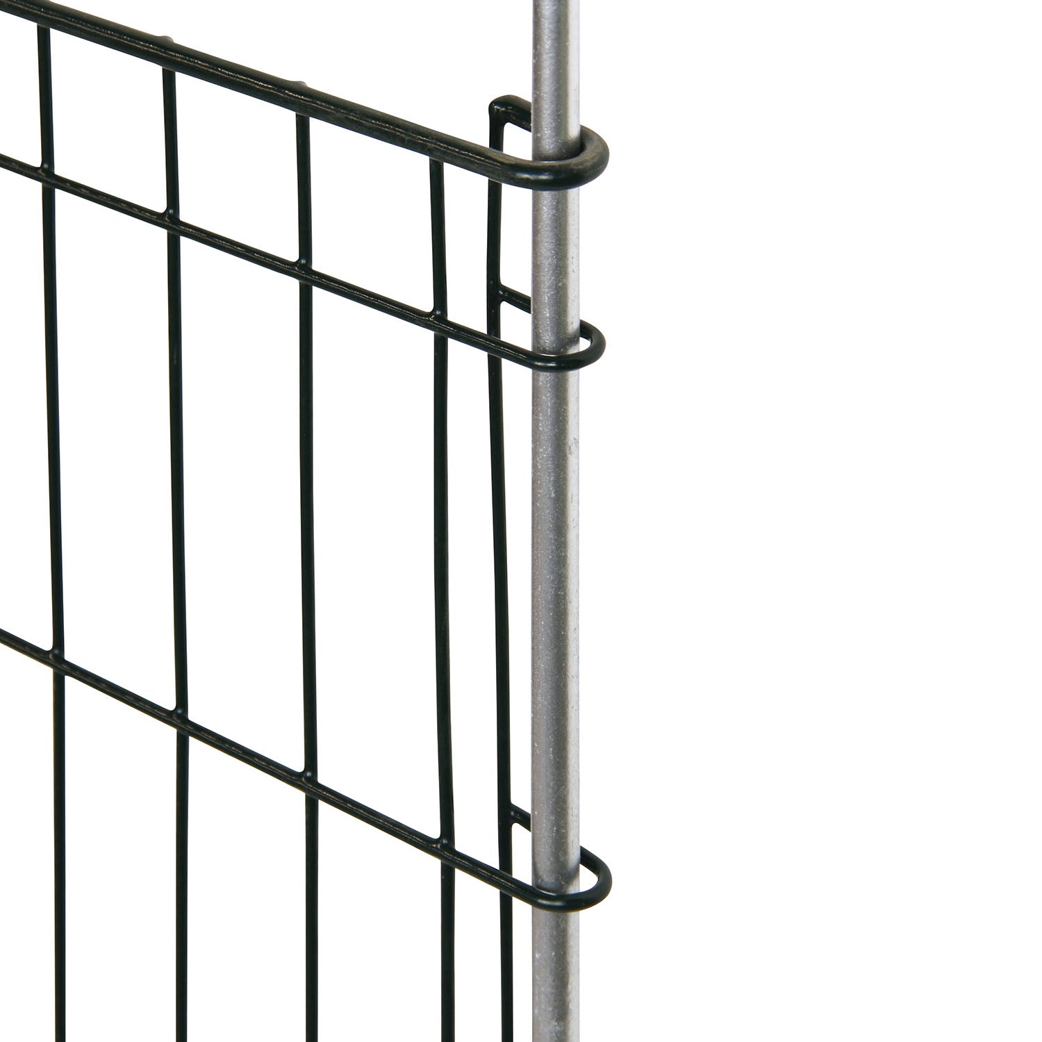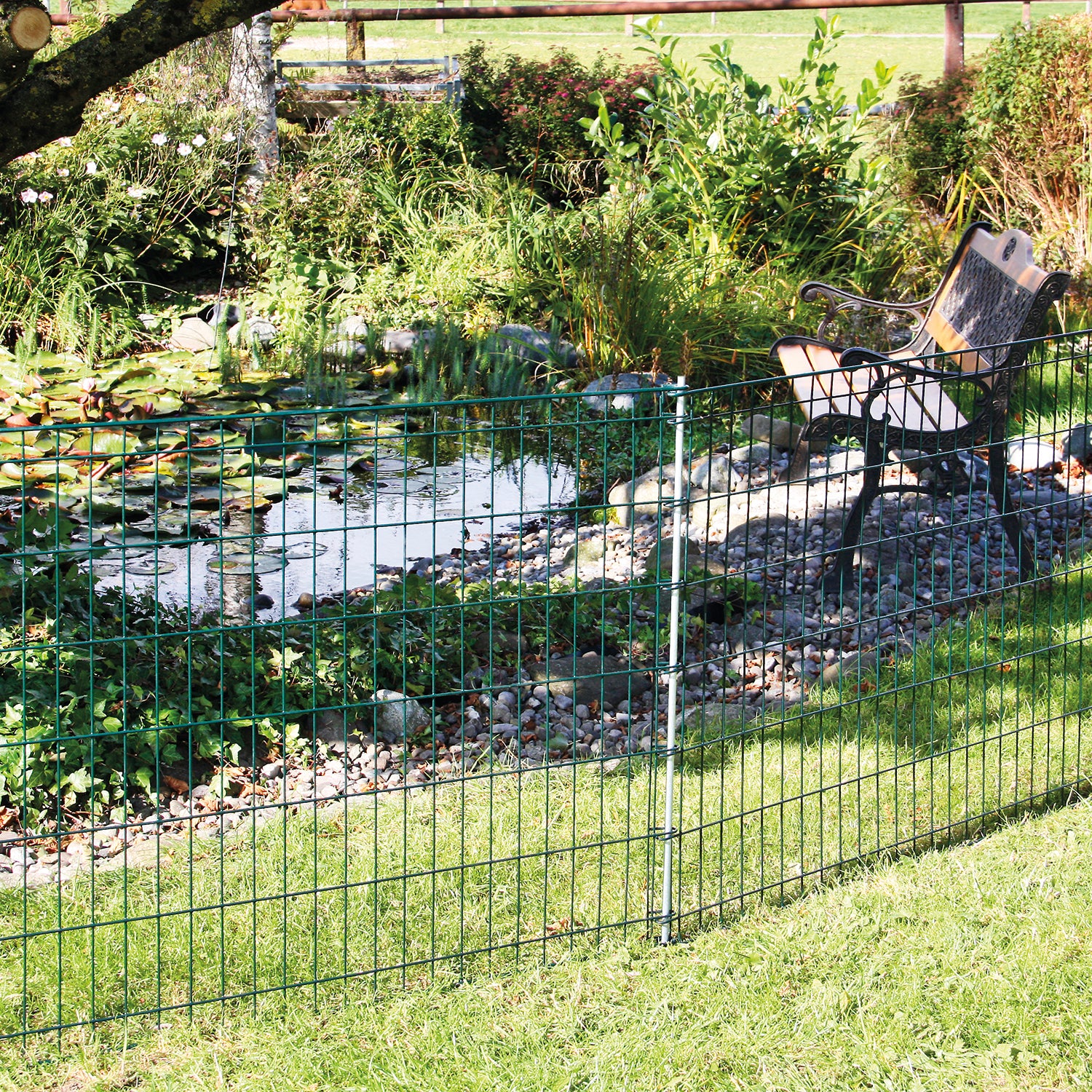 Aufgrund seiner Konstruktion kann das Zaunelement wahlweise gerade oder in einem Winkel von ca. 240 Grad zum nächsten Element aufgestellt, oder sogar in einem, dem Teich oder Garten angepassten Radius montiert werden. Die Einzelelemente aus grün beschichtetem Draht lassen sich flexibel, z. B. als Teichschutzzaun, Spielplatzbegrenzung, Garten- und Terrassenabgrenzung, Tiergehege, Baumschutzzaun oder Staudenstützgitter einsetzen. Die einfache Steckverbindung mittels stabilem, verzinktem Bodenanker macht den Auf- und Abbau kinderleicht. Und ändert sich die Einteilung oder der Verwendungszweck im Garten, wird in kürzester Zeit umgesteckt und neu gestaltet. Jedes Element ist auch als Türelement verwendbar. Der Bodenanker ist im Lieferumfang enthalten. Teichschutzzaun ohne Schnörkel