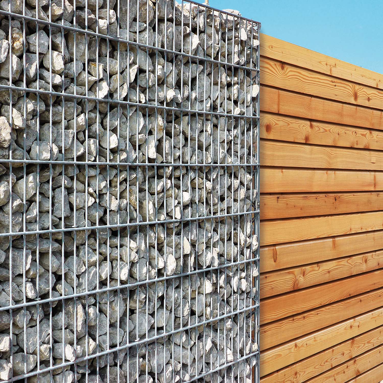 Gestalten Sie ihre Gabionenmauer mit Holzelementen! Die Möglichkeiten der Gestaltung mit dem U-Profil sind vielfältig. Der Einbau von Holzelementen in eine Gabionenmauer lockert die massive Optik auf und ermöglicht farbliche Kontraste, z.B. dunkle Steine, heller Holzzaun, etc. zu setzen. Das U-Profil wird an den Gabionenkorb montiert oder kann direkt an einer Haus- oder Garagenwand befestigt werden. Die Holzlamellen/-dielen (Holzstärke max. 30 mm) werden anschließend in die Schiene geschoben und befestigt.