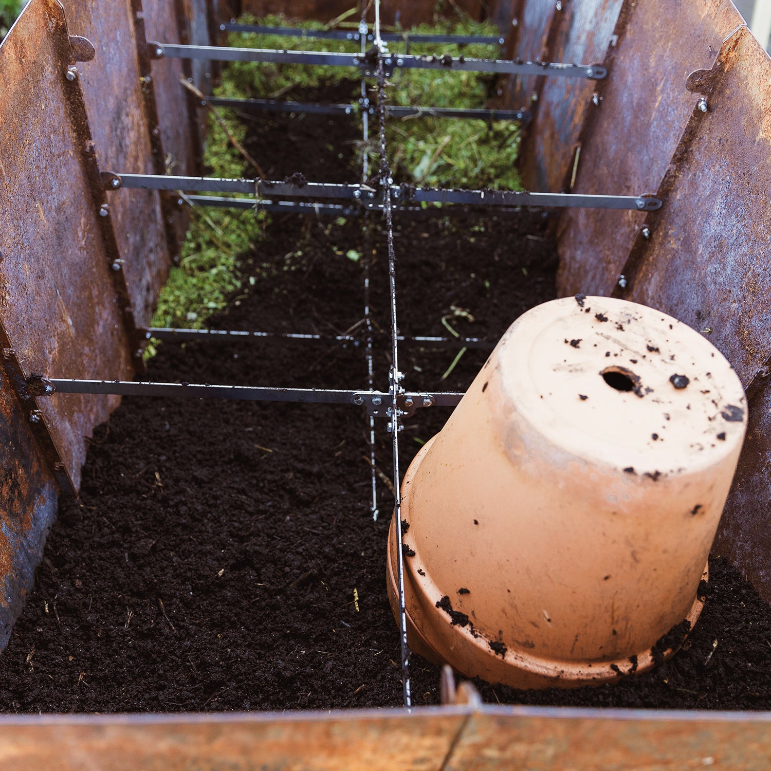 Das Hochbeetsystem besteht aus hochwertigem Cortenstahl, der durch seine spezielle Legierung eine schützende Rostschicht bildet, die den Stahl vor Korrosion schützt.