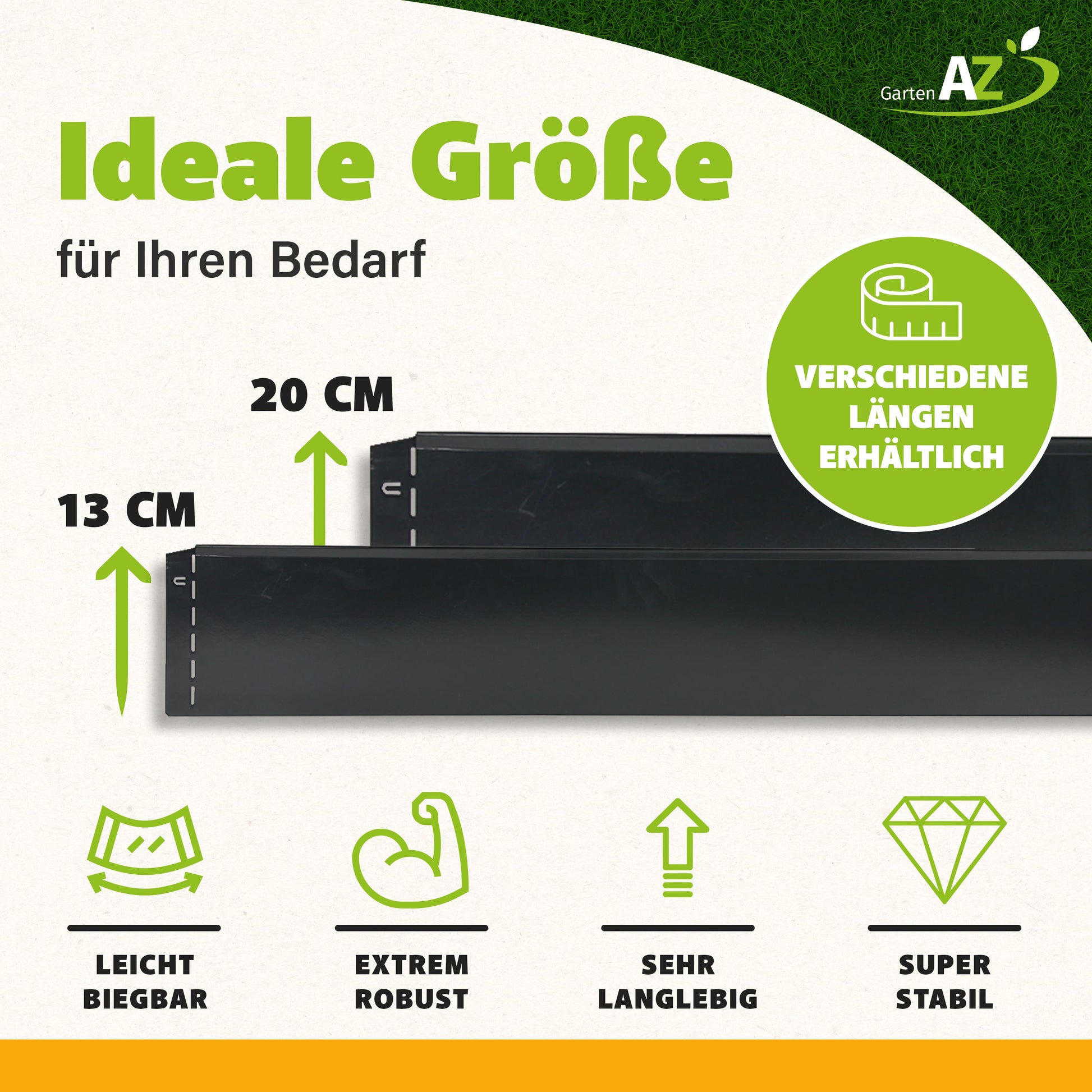 Die Maße der Rasenkante sind 13 cm hoch und 100 cm lang. Sie ist aus 0,65 mm starkem, feuerverzinktem Stahlblech gefertigt und zusätzlich anthrazitfarben pulverbeschichtet.